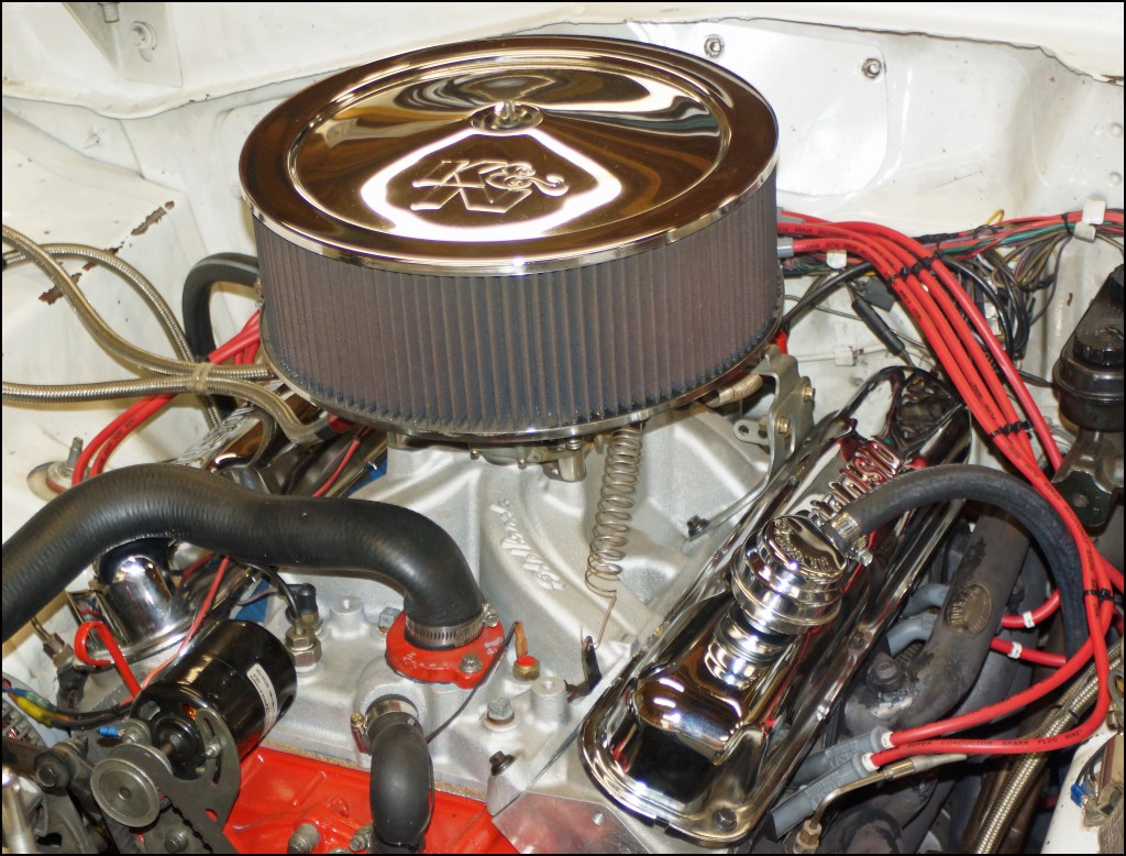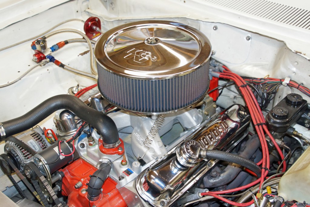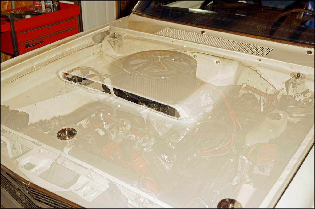 The 340 is nestled into the ‘69 Dart’s engine bay. The 14” x 5” K&N air filter housing fits up inside the fiberglass six-pack hood scoop. With the air filter housing in place, the under hood clearance is limited, so only 1-inch spacers would be evaluated. If there had been addition under hood clearance, thicker spacers could have been tested. Manufacturers can manufacturer spacers from 1/8” to 2” or more if desired for a specific application.