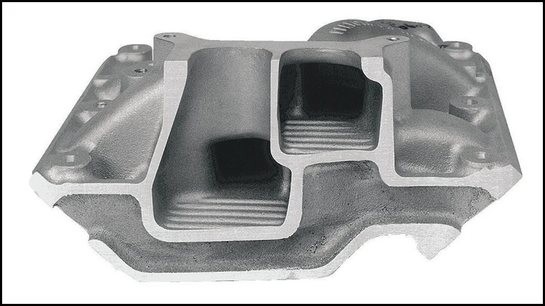 Edelbrock’s Torker II (part no. EDL-5076) features a low-rise, single-plane casting that is designed to maximize the top-end horsepower without disturbing the mid-range power. The intake is designed to minimize the turns of the intake runners, thus allowing the air-fuel charge a nearly straight shot from the carburetor to the intake valves. This manifold is designed to make power from 2,500 to 6,500 rpm. (Edelbrock photo)
