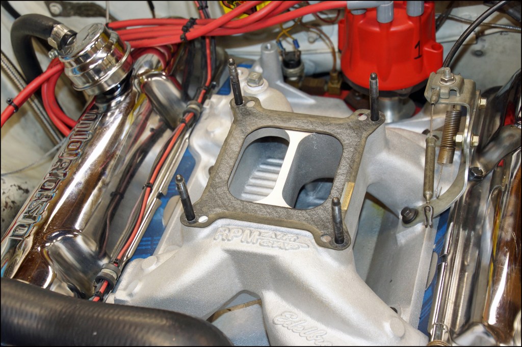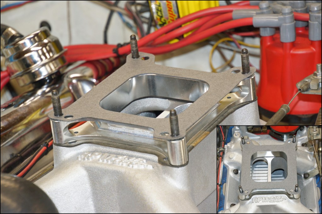 The use of a carburetor spacer provides a two-fold benefit. One, the intake plenum volume is increased by lengthening the plenum height, and two, moving the carburetor higher on the manifold increases the distance between the carburetor and the manifold floor providing a less abrupt turn for the air-fuel charge from the carburetor to the intake valve. A smoother transition will allow the fuel to remain suspended in the air rather than slamming into the manifold’s floor and puddling within the plenum. A more homogeneous air-fuel charge will always benefit the performance of the engine.