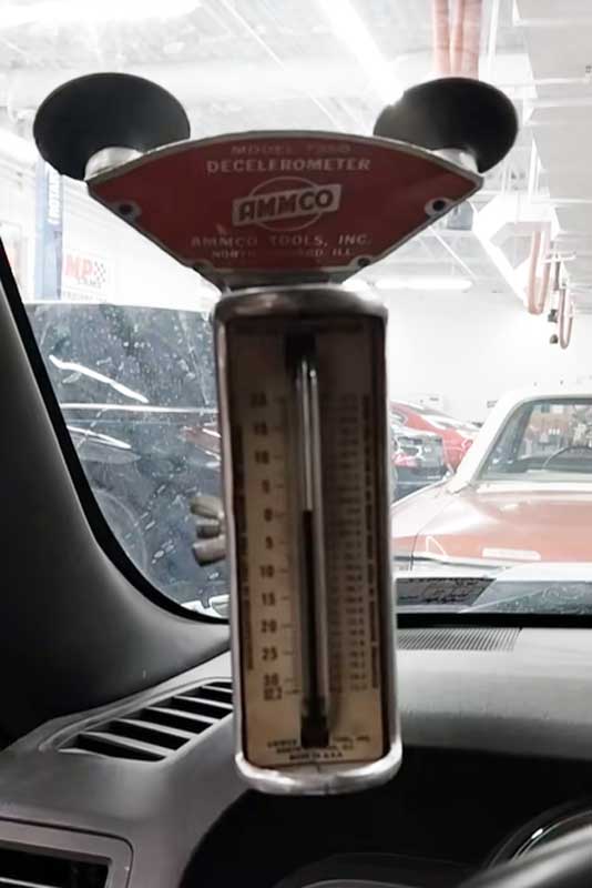 A technician would complete the brake service with new shoes, machined drums, and renewed hardware. A controlled road test would follow with the decelerometer secured in position. The deceleration reading would be observed and recorded. The result could then be compared against a specification or previous measurements.